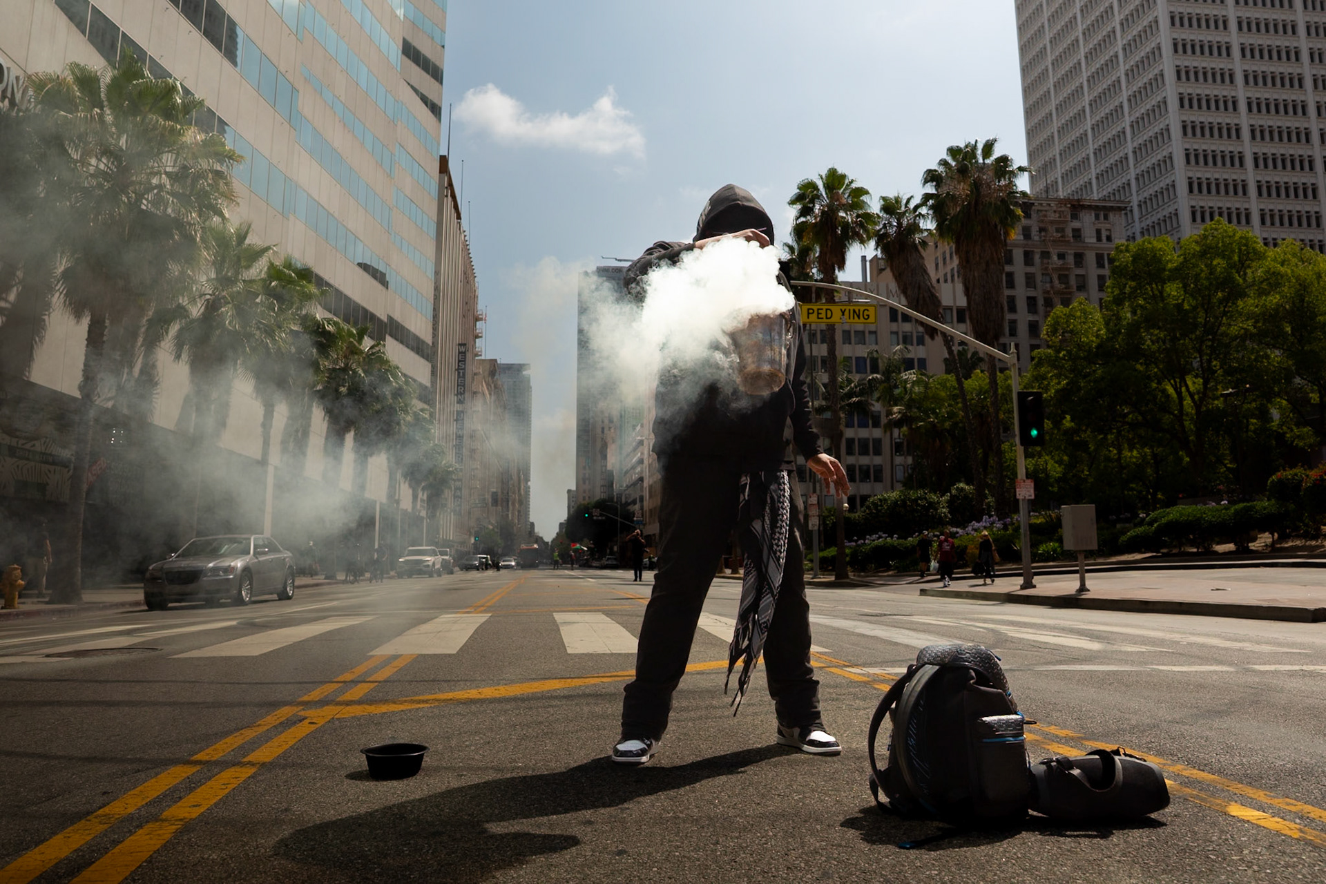 A demonstrator in Donwtown Los Angeles, Calif. on June 8, 2025 during a protest against immigration raids conducted by ICE and Federal police.